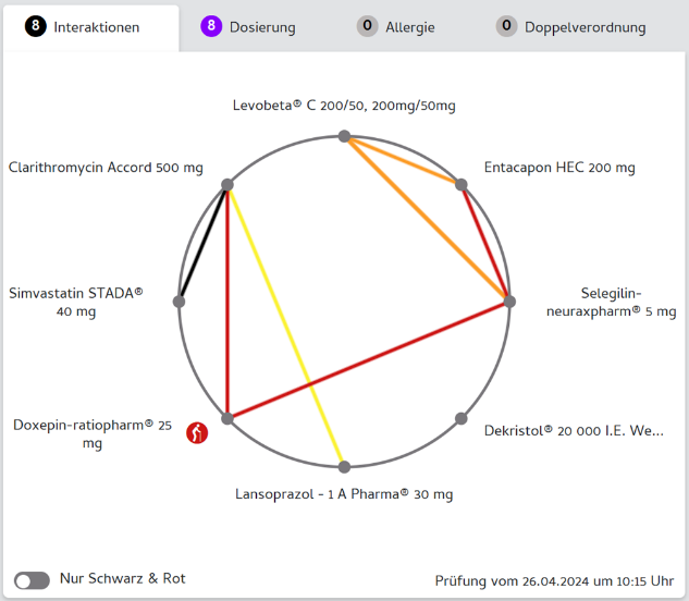 Rote Visualisierung z.B. symbolisiert Interaktionen mit potentiell klinisch schwerwiegenden UAW, gelbe Visualisierung, dass selten klinisch relevante Interaktionen vorliegen.