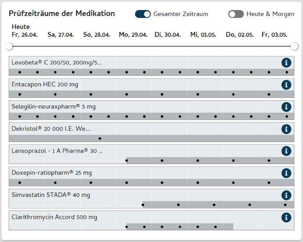 Medikamentengabe. Im Mouseover ist das dazugehörige Dosierschema für den jeweiligen Tag zu sehen. Die Prüfzeitstrahlen zeigen, über welchen Zeitraum die einzelnen Präparate in die AMTS-Prüfung eingehen.