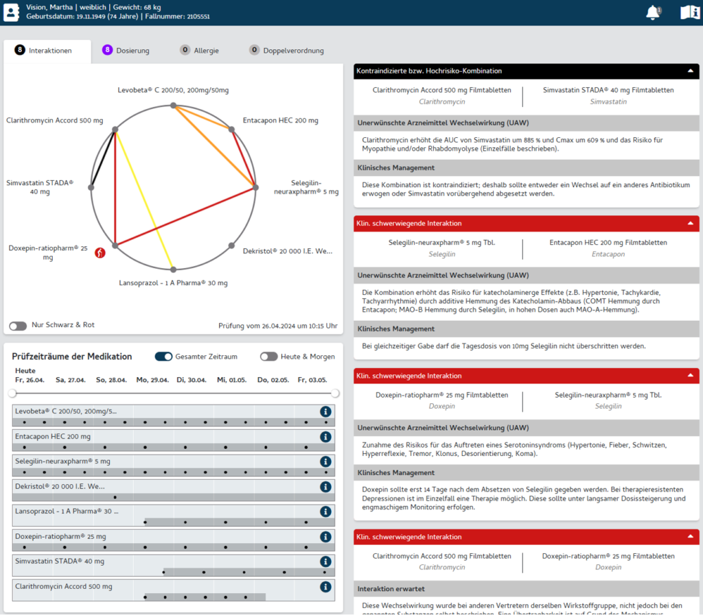 • Visualisierung der Warnungen in unterschiedlichen Schweregraden zu Zweier-, Dreier- und Vierer-Interaktionen mit detaillierten Erläuterungen der unerwünschten Wechselwirkungen